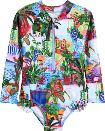 Let your child splash and play in this sweet one-piece, ruffle-trimmed swimsuit made with sun protection and covered in a vivid vacation-inspired print.