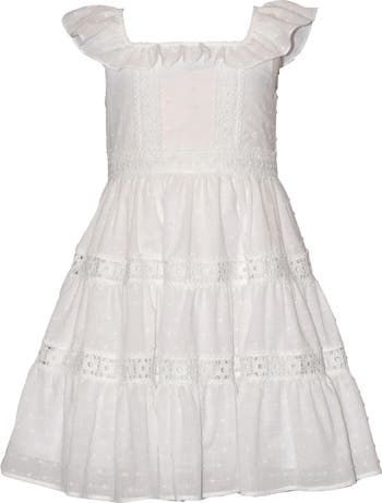 Pretty lace and eyelet trim detail this clip-dot dress that flares out into a beautifully tiered skirt.