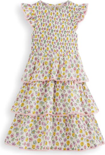Watch them twist and twirl in this tiered cotton dress made with a smocked bodice, flutter sleeves and lacy trim.