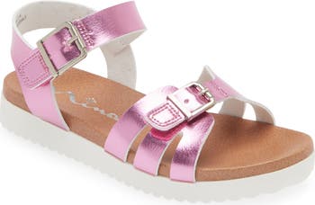 Hook-and-loop straps and a grippy rubber sole provide a cozy fit in this pint-sized strappy sandal crafted from shimmering faux leather.