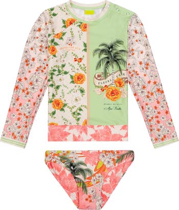 Your budding trendsetter will look forward to pool days and getaways in this two-piece swimsuit featuring a rashguard top and reversible bottoms.