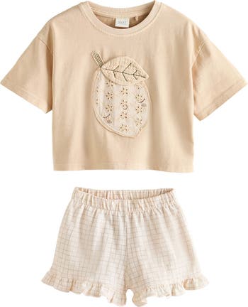 A dimensional lemon appliqué squeezes even more charm into this kid-size set that pairs a cotton T-shirt with ruffle-trim shorts.