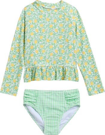 A fluttery peplum furthers the playful vibe of this two-piece swimsuit featuring a long-sleeve rashguard that protects your youngster from the sun, sand and surf, and coordinating bottoms.