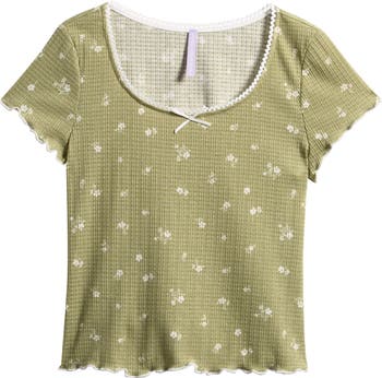 Lettuce edges and a retro floral print emphasize the vintage vibe of this kid-sized T-shirt sweetened with a scalloped neckline and a satin bow.