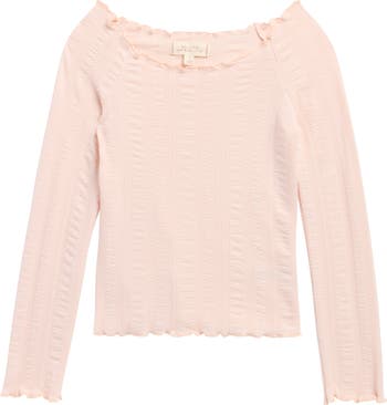 Crinkly lettuce edging traces the ballet neckling, cuffs and hem of this soft and stretchy rib-knit top.