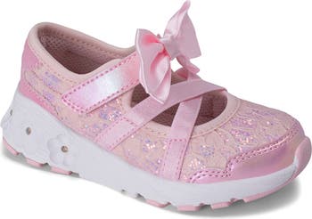 Sparkly flowers and tiny lights flickering in the midsole make every step a party in a pint-size sneaker with easy-on/stay-on construction and a flat base for confident standing and walking.