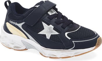 Bring Y2K nostalgia to your kiddo's footwear game with this navy athletic sneaker new to Golden Goose's lineup of handcrafted styles. Lacy panels add breathability and a sweet delicacy to the look, while a scuffed-up finish adds signature old-favorite vibes.