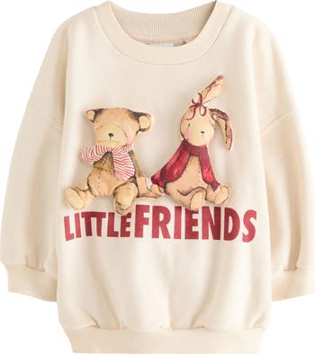 Stuffed pals pose on a roomy cotton-rich sweatshirt to bring a smile to your imaginative little one.