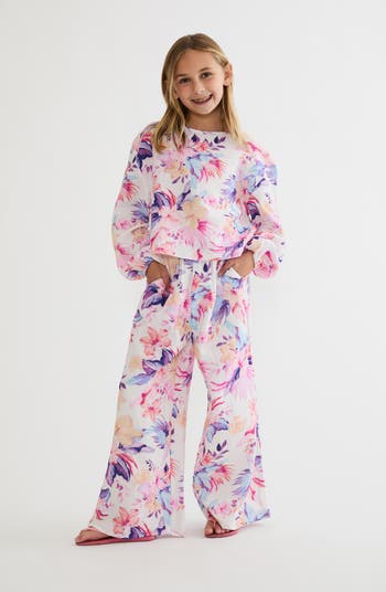 Your kiddo can stay covered up while keeping cool on warm, sunny days in these sweet wide-leg pants made from light, airy cotton gauze patterned with a tropical watercolor print.