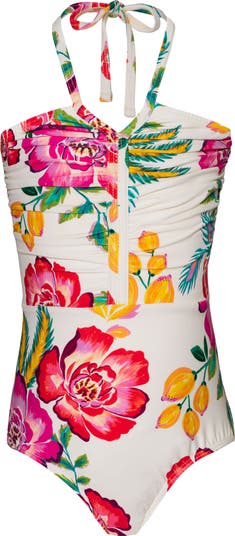 Texture and color are abundant in this floral-print swimsuit sized for junior trendsetters who take their style all the way to the beach.