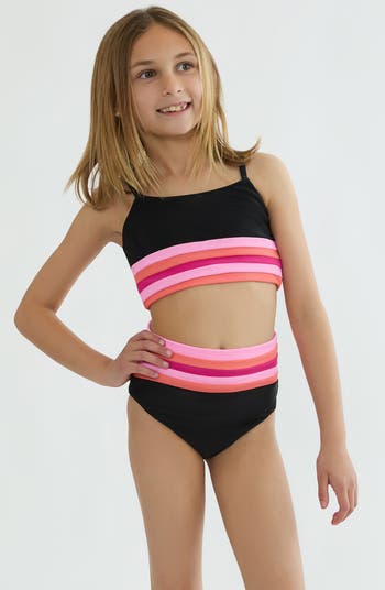 This ribbed two-piece swimsuit gives their poolside look sporty flair with bold colorblocking.