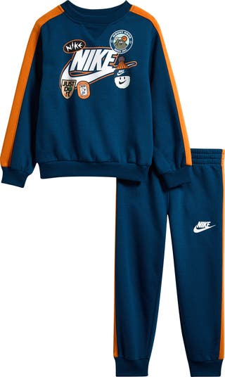 Wintry fun inspires the colorful Nike logos marking a cotton-blend fleece sweatshirt that pairs with matching joggers to keep your kid comfy all season long. Racing stripes on the legs and sleeves amp up the energy for playtime and add a sporty pop when it's time to relax.