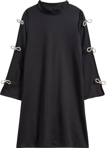 Rhinestone bows twinkle at the slit long sleeves of this mock-neck shift dress made just for junior trendsetters.