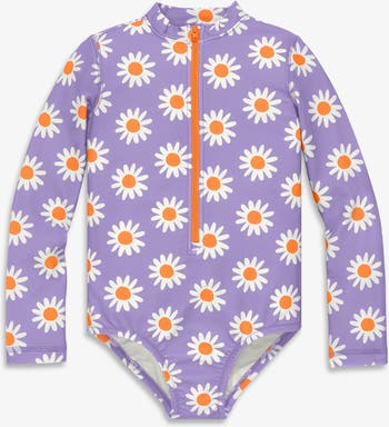 Suit up for sunny days in this one-piece rash guard. Style features a half zipper for even easier on-and-off—to tide them over on sunny days. It's fully lined, lightweight, smooth and stretchy with long sleeves for slather-free sun protection. Fabric is 80% recycled nylon and 20% spandex, with UPF 50+ protection.