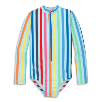 A UPF 50+ one-piece rash guard in a colorful rainbow stripe that's not only an instant mood-booster, but easy to spot on crowded beaches, too. (IYKYK!) 80% recycled nylon/20% spandex UPF 50+ protection Half-zipper for easy dressing Fully lined