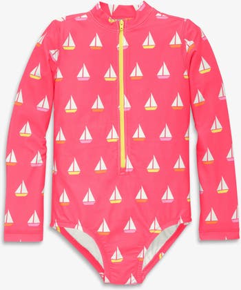 Suit up for sunny days in this one-piece rash guard. Style features a half zipper for even easier on-and-off—to tide them over on sunny days. It's fully lined, lightweight, smooth and stretchy with long sleeves for slather-free sun protection. Fabric is 80% recycled nylon and 20% spandex, with UPF 50+ protection.