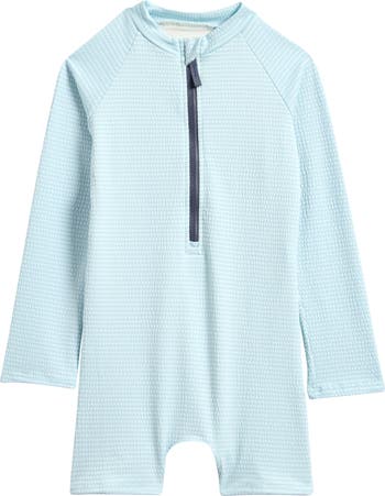 A half-zip placket makes it easy to get your little one into this stretchy rashguard swimsuit that's framed by long sleeves.