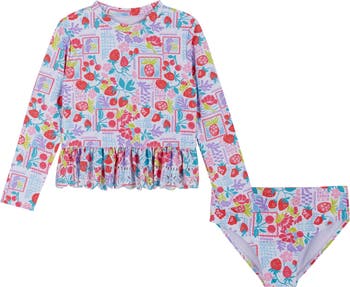 Watch them splash and play in this two-piece swimsuit featuring a long-sleeve rashguard made with a flouncy peplum and paired with matching bottoms.
