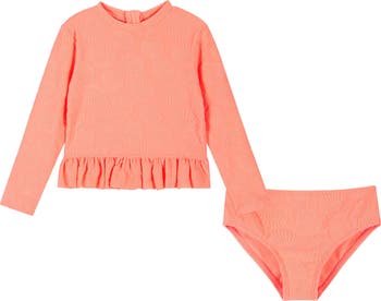Watch them splash and play in this two-piece swimsuit featuring a jacquard-terry rashguard with a flouncy peplum and matching bottoms.