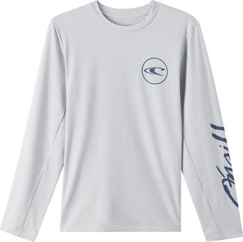 They will spend a day in the waves wearing this protective long-sleeve rashguard styled with a classic crewneck and a sporty logo design.