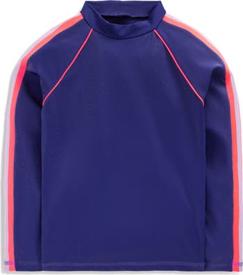 Bright stripes highlight a long-sleeve rashguard that will help keep your child protected from the sun, surf and sand.