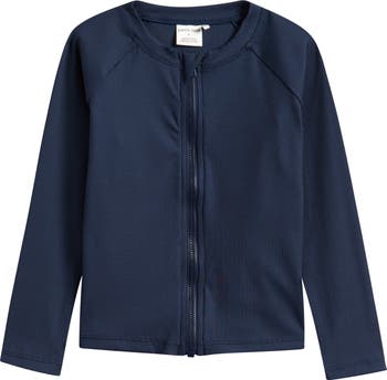 A full-zip placket makes it easy for your kiddo to slip into this ribbed rashguard framed by raglan sleeves that offer protection from the sun, sand and surf.