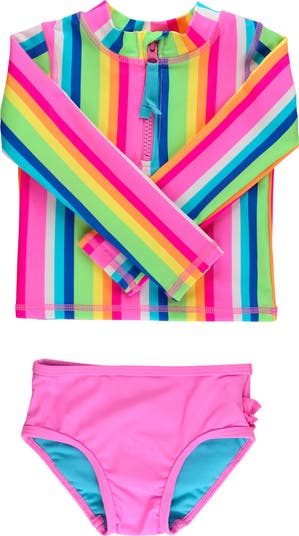 Signature ruffles flutter across the hem of this two-piece swimsuit topped by a playful rashguard with built-in sun protection to keep them splashing.