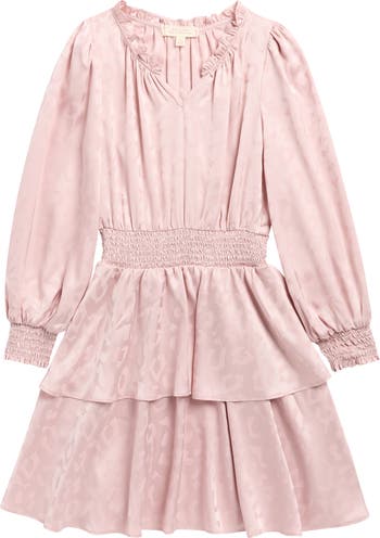 They'll love the dimensional jacquard pattern on this tiered satin dress that has a ruffled split neck and a softly smocked waist.