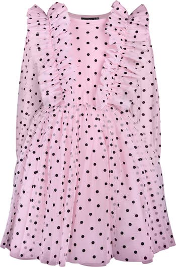 Flocked polka dots are sprinkled all over this frothy tulle dress that's made to twirl.