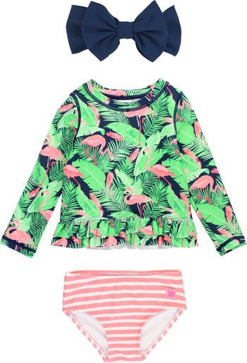 Watch your little adventurer make a splash in this two-piece featuring a coordinating headband and signature ruffles along the bottoms.