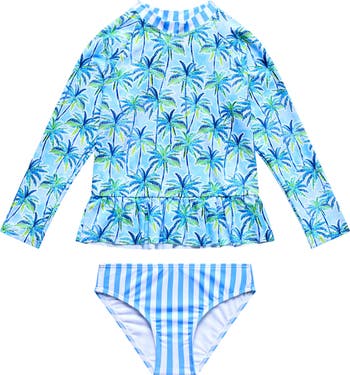 Your youngster will be splashing and playing happily in this two-piece swimsuit featuring a long-sleeve rashguard and coordinating bottoms.