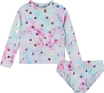 Watch them play and splash in the water wearing this precious tie-dye two-piece adorned with shimmery little stars.