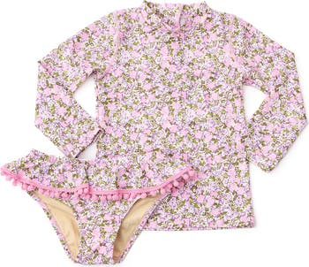 Zigzag stitches ensure this two-piece swimsuit stays in place while the built-in sun protection keeps your little one splashing happily. It features a long-sleeve rashguard that blocks out the sun, sand and surf and pom-trimmed bottoms that have a ruffled flounce.