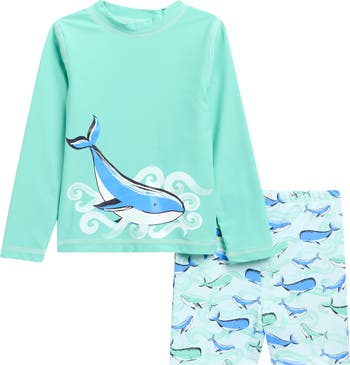 Watch them splash and play in this coordinating two-piece swimsuit featuring a striped long-sleeve rashguard and printed swim trunks that both have built-in sun protection.