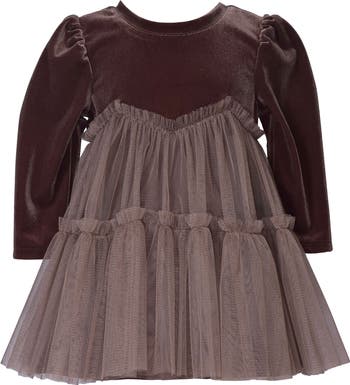 Tiered tulle brings fanciful volume to holiday parties in a long-sleeve dress made with a contrasting velvet bodice.