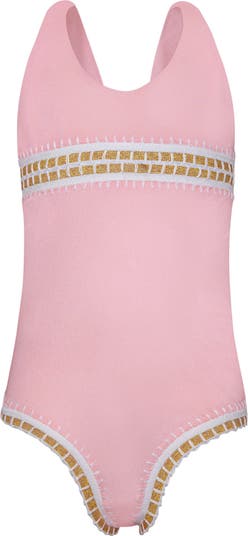 A shimmering trim and whipstitching lend kid-approved style to this one-piece swimsuit ready to make a splash.