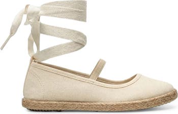 An elasticized mary jane strap and wraparound ankle ties offer a stylishly secure fit on an espadrille-inspired flat featuring woven jute trim and a play-ready rubber sole.