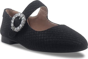 A jewel-encrusted buckle adds shimmer and shine to a glitter-dusted mary jane flat featuring a cushioned footbed for kid-approved comfort.
