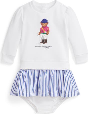 The label's iconic polo bear stars on this cozy magic fleece dress finished with a striped cotton skirt and paired with coordinating bloomers to give baby a complete look.