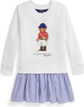 The label's iconic polo bear stars on this kid-size dress made with a cozy magic fleece bodice and finished with a breezy striped cotton skirt.