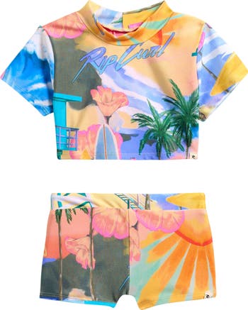 They'll be feeling confident as they dip and dive in this two-piece swimsuit featuring a cropped rashguard top and sporty shorts.