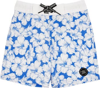 Four-way-stretch fabric with sun protection stays comfortable in the water and on land in kid-sized board shorts detailed with a tropical-inspired floral print.