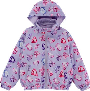 They'll be prepared for rainy days in this water-repellent windbreaker that reverses from a print to solid for two looks in one. A stowaway hood offers optional extra coverage and when the sun comes out the jacket can be packed into a star-shaped pouch.