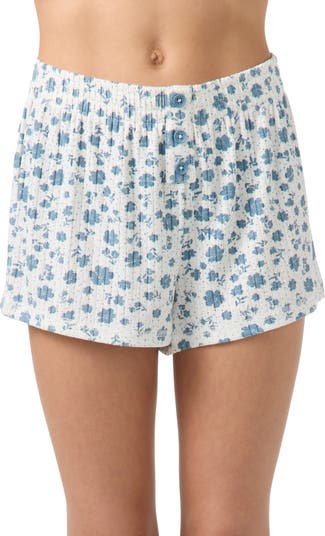Blue-hued flowers fall around comfy everyday shorts fitted with an elasticized waist.