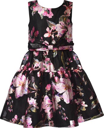 A metallic sheen defines each and every bloom on this elegant party dress defined at the waist by a knotted sash.