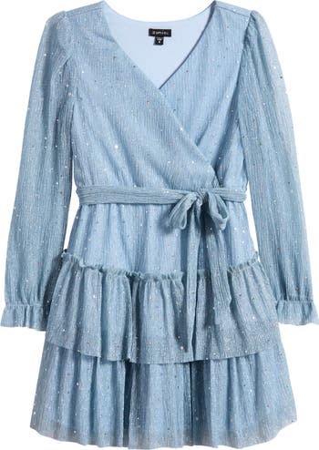 Silvery sparkles and metallic threads highlight this party-ready dress finished with a frilly tiered skirt.