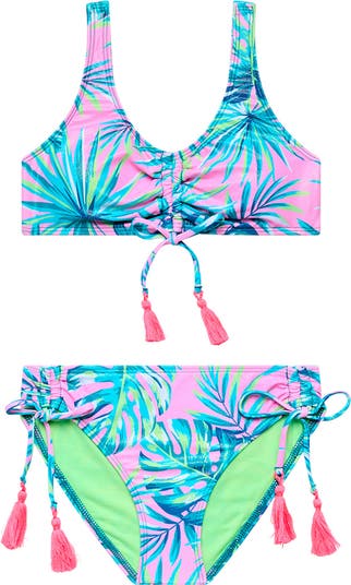 They'll love the tassel-trimmed ties on this metallic two-piece swimsuit made with ruched details.