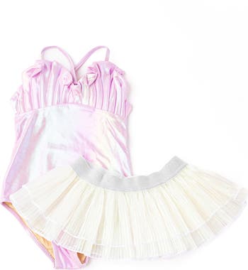 Zigzag stitches ensure this shiny, mermaid-inspired one-piece swimsuit stays in place while the built-in sun protection keeps your little one splashing happily. It features a coordinating plissé cover-up skirt that only adds to the glam vibe of their pool-party-ready look.