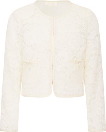 Delicate floral lace and bow-embellished patch pockets bring enchanting charm to this cropped jacket that's perfect for your young trendsetter's next special moment.