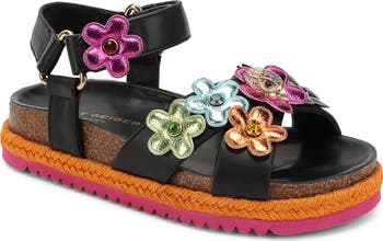 Rainbow-hued floral appliqués and sparkly eagle-head hardware bring signature style to this kid-size sandal emboldened by a colorful espadrille-inspired midsole.
